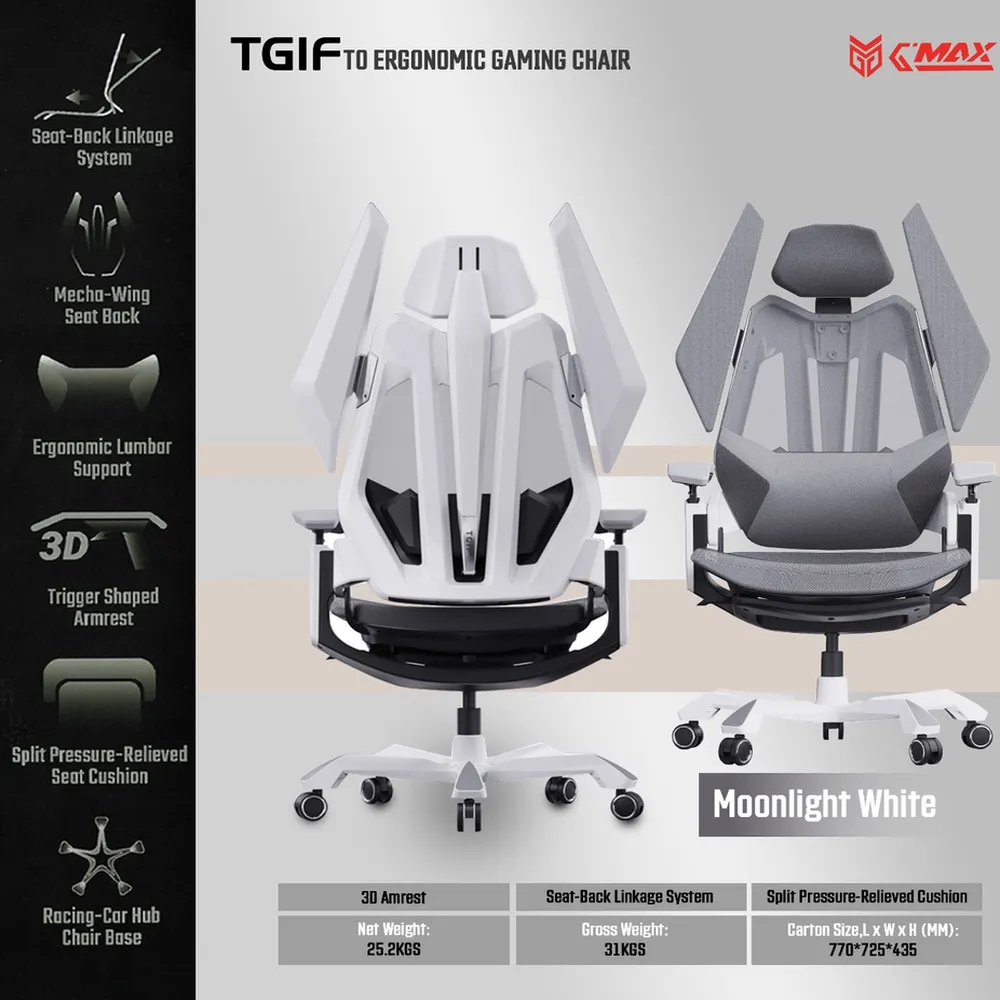 G-MAX TGIF Ergonomic Gaming Chair, Ergonomic Lumbar Support, 3D Trigger Shaped Armrest, Racing-Car Hub Chair Base, Seat-Back Linkage System, Mecha-Wing Seat Back, White, 1 Year Warranty | GMC-ACE-W
