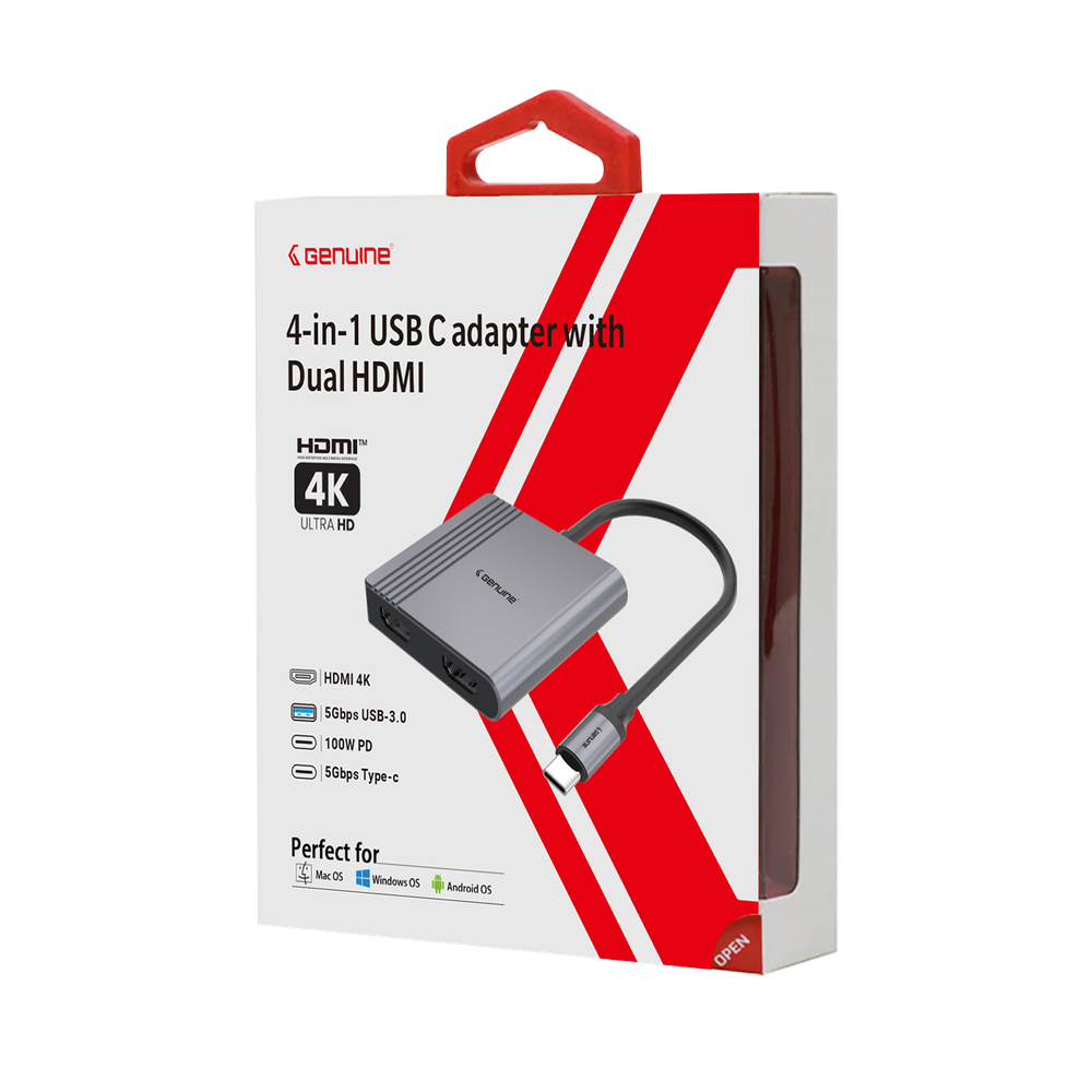 Genuine 4-in 1 Type C to USB-A 3.0 + HDMI + PD Adapter, 180mm Cable Length, Input Type-C 3.1 Male, Fast charging up to 100W, Grey/Customized, 1 Year Warranty | GN-DC44J