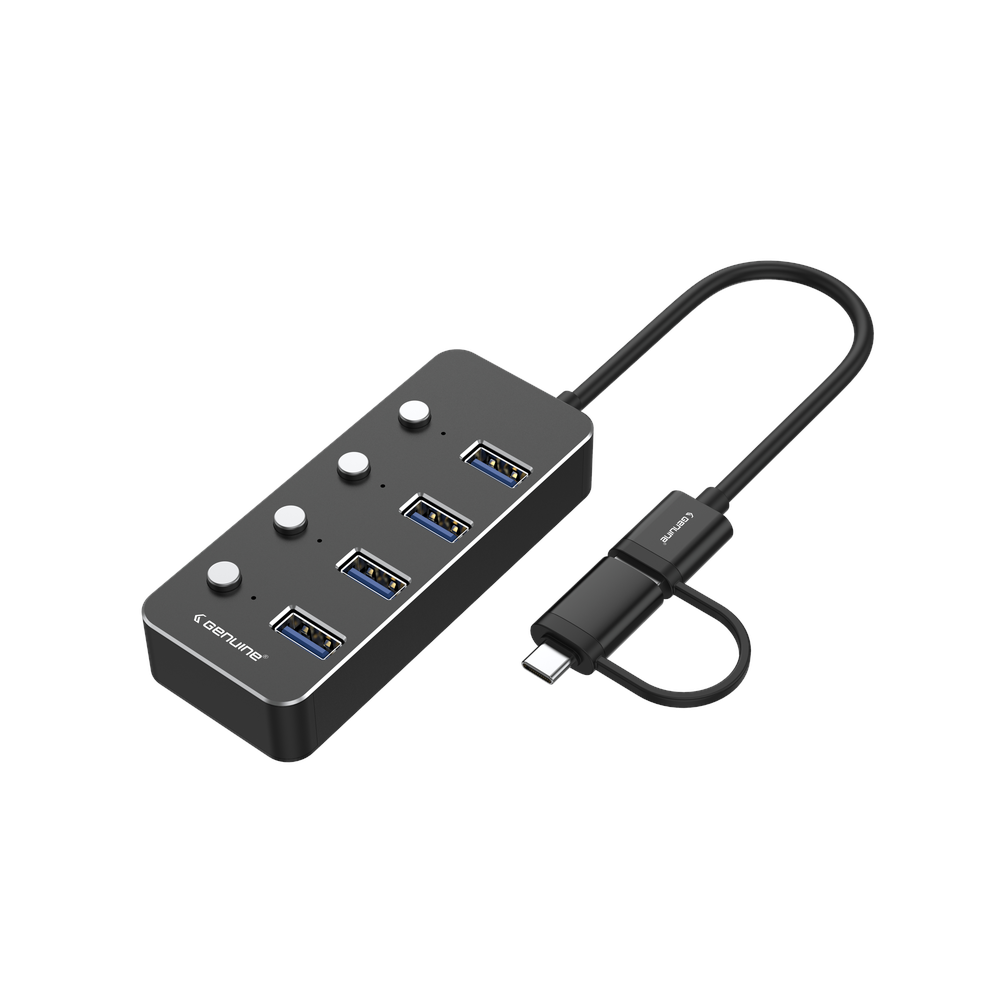 Genuine 4 Port USB 3.0 HUB, 180mm Cable Length, Input USB A + C 3.0 Male, Transfer rate up to 5Gbps, Black/Silver/Customized, 1 Year Warranty | GN-HU34E