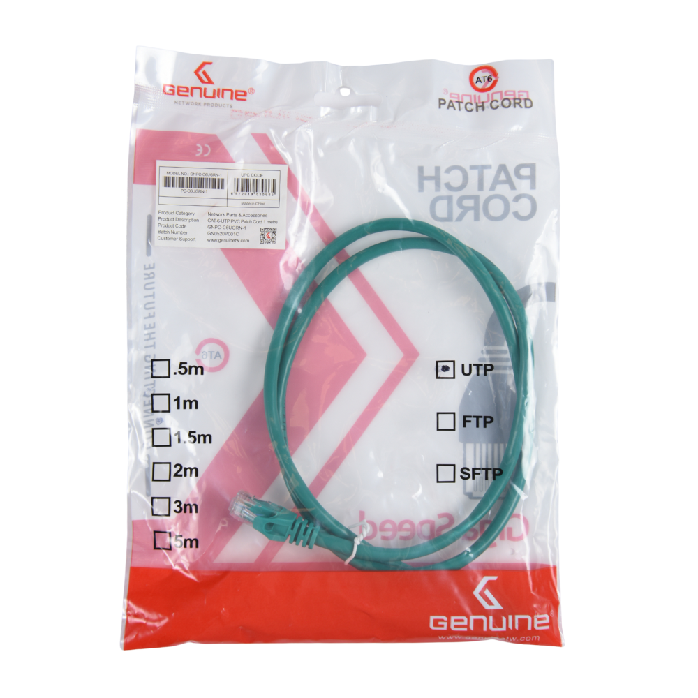 Genuine CAT6 Patch Cord Cable, 5M Length, Supports Gigabit Ethernet (1000 Base-T), 250MHz Bandwidth, Green, 1 Year Warranty | GNPC-C6UGRN-5