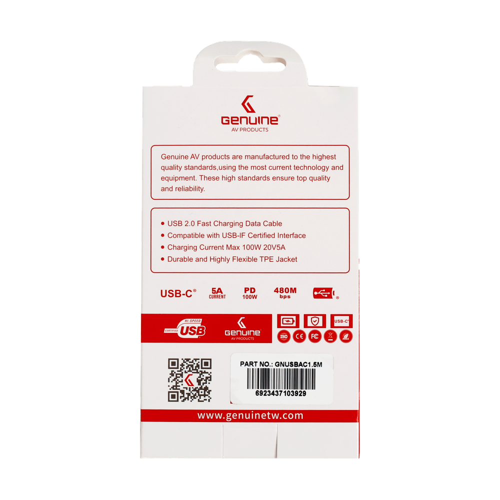Genuine USB 2.0 – A to C Cable, Cable Length 1.5M, 100W, Black, 1 Year Warranty | GN-USBAC1.5M-BK